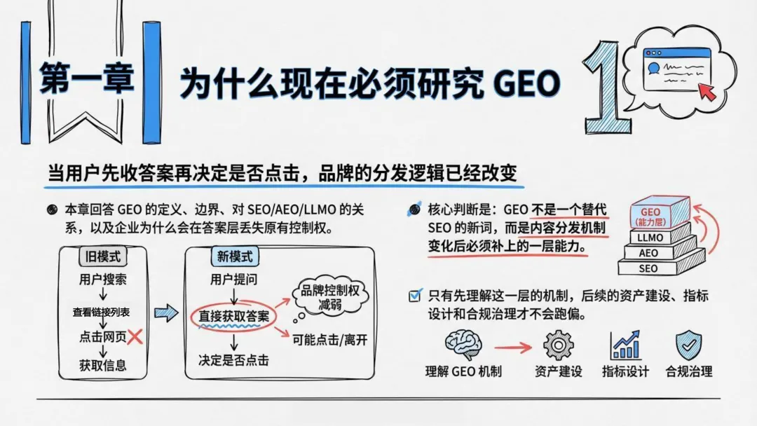 这五个概念把GEO从零散的动作,变成了一套可测量、可管理、可优化的战略框架。