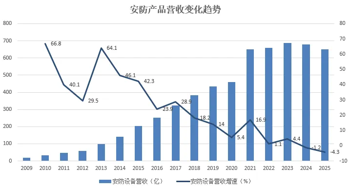 2020年以前,虽然营收增速逐年放缓,但是增速始终在10%以上。2020年以后,增速在0附近小幅波动,也就是安防业务营收不再增长。