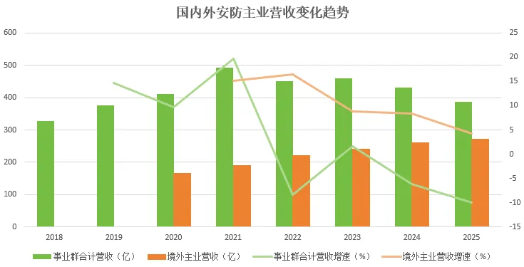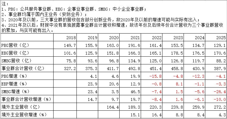 2018年,公司重组安防业务,从2019年开始,公司财报披露各事业群的营收数据,2021年开始,财报披露境外主业营收数据,如下表所示。