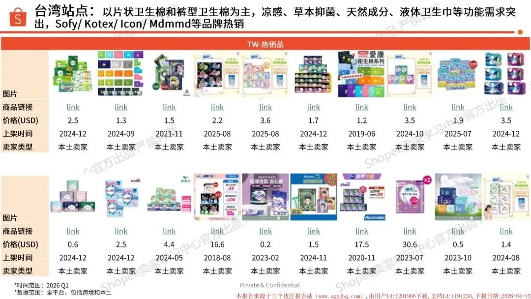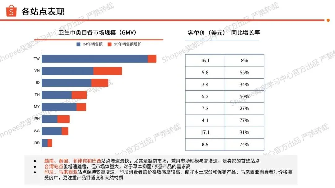 2026 年 Shopee 平台卫生巾品类呈现多站点差异化增长态势,越南、泰国、菲律宾、巴西增速领跑,其中越南兼具规模与高增长,为核心优选市场;台湾市场体量庞大但增速放缓,偏好草本抑菌、凉感类产品;