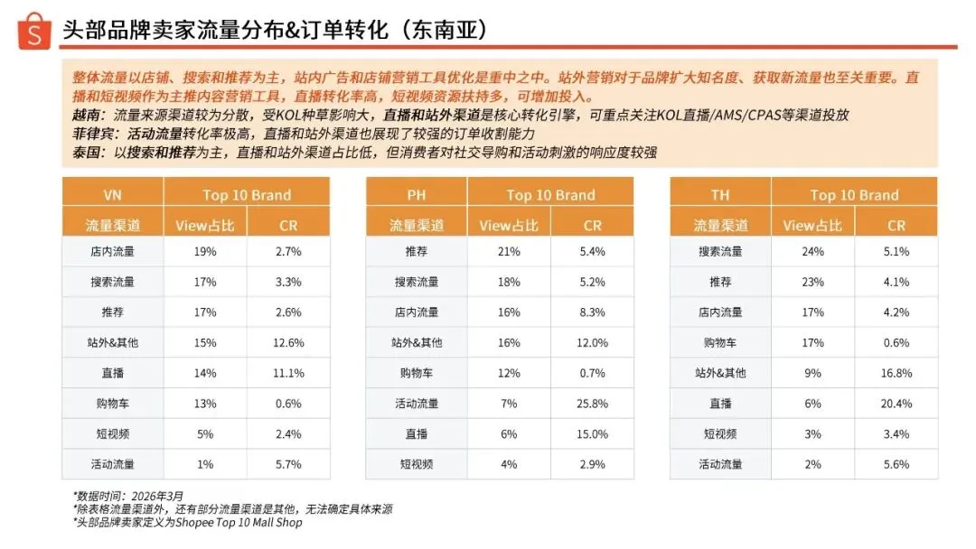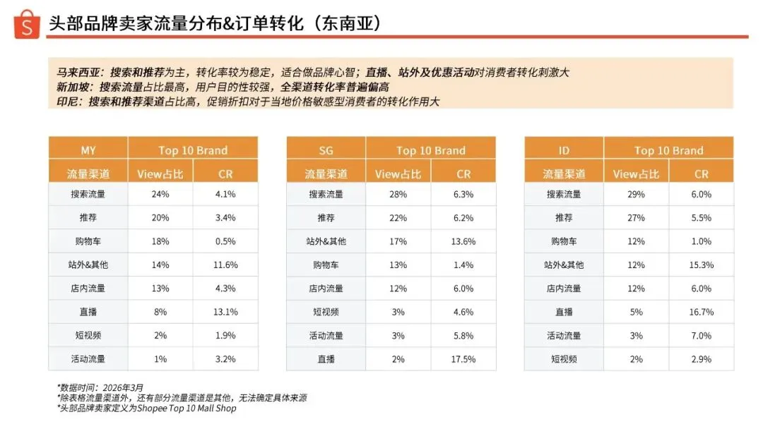流量与转化方面,东南亚头部品牌整体以店铺、搜索、推荐为主要流量来源,站内广告与营销工具是运营关键,站外推广、直播、短视频对引流与转化作用显著。