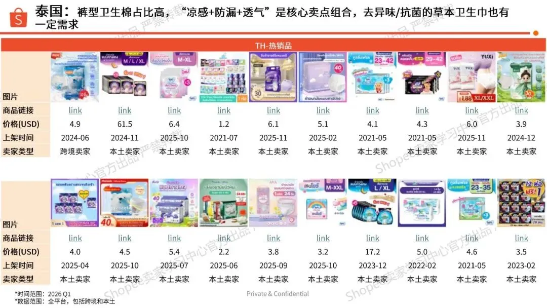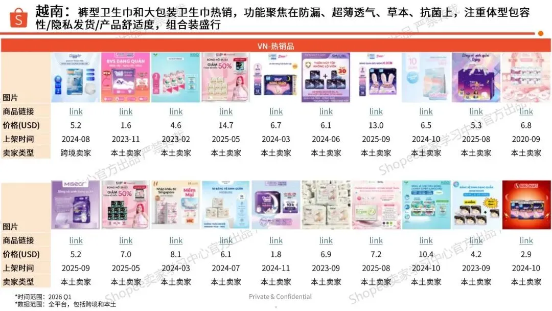 各站点热销产品与需求差异清晰,越南热销裤型与大包装卫生巾,主打防漏、超薄透气、草本抗菌,注重隐私发货与组合装;泰国裤型卫生棉占比高,凉感、防漏、透气为核心卖点,草本抗菌、去异味产品有需求;