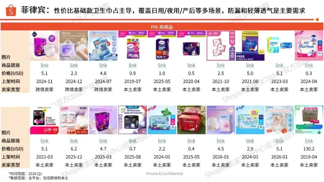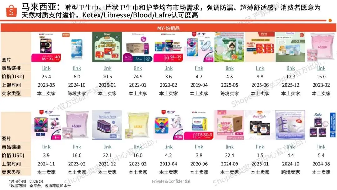 马来西亚裤型、片状、护垫均有市场,防漏、超薄舒适受关注,天然材质可支撑溢价;菲律宾以性价比基础款为主,覆盖多场景,核心需求为防漏与轻薄透气;