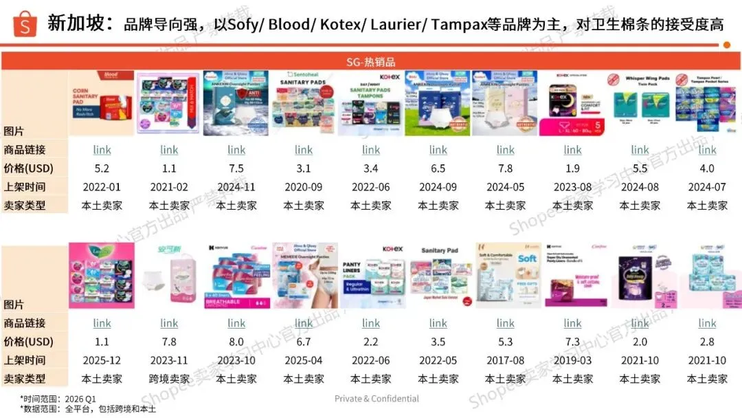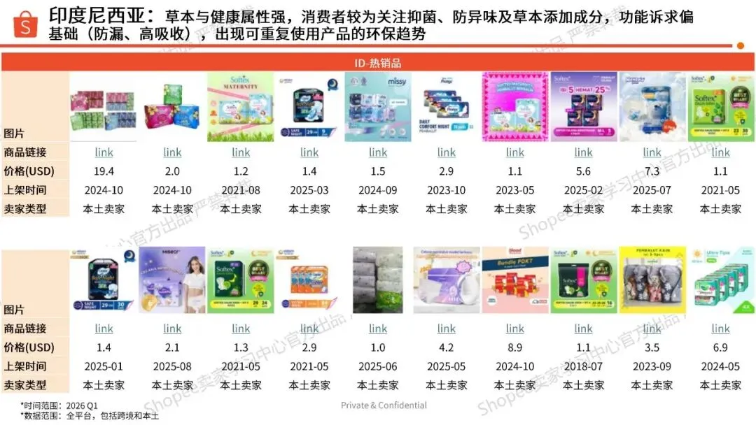印尼、马来西亚增长稳健,印尼消费者价格敏感、青睐本土成分与促销商品,马来西亚消费者接受度广,更看重舒适度与天然材质;新加坡、巴西市场各有特色,新加坡品牌导向明显,巴西侧重高吸收与大规格囤货装。