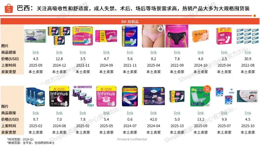 新加坡品牌集中度高,卫生棉条接受度高;巴西聚焦高吸收、舒适度,成人失禁、产后等场景需求大,囤货装更受欢迎。