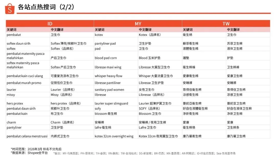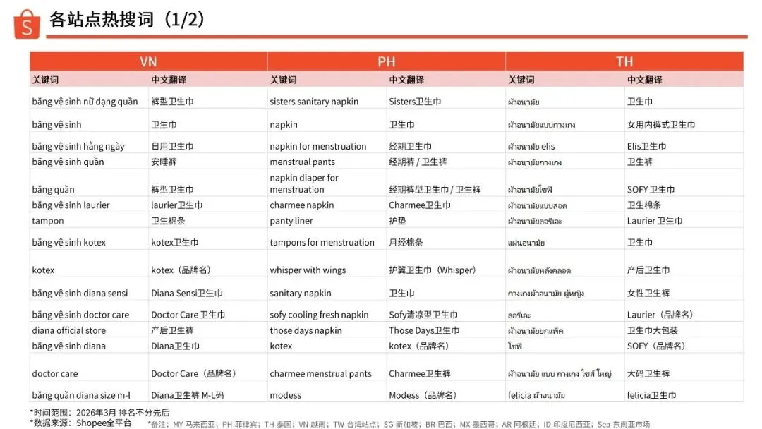 热搜词反映各地消费偏好,越南、泰国高频搜索裤型卫生巾,印尼关注槟榔叶、产后、可重复使用等关键词,马来西亚、台湾、新加坡则以品牌词、功能词为主。