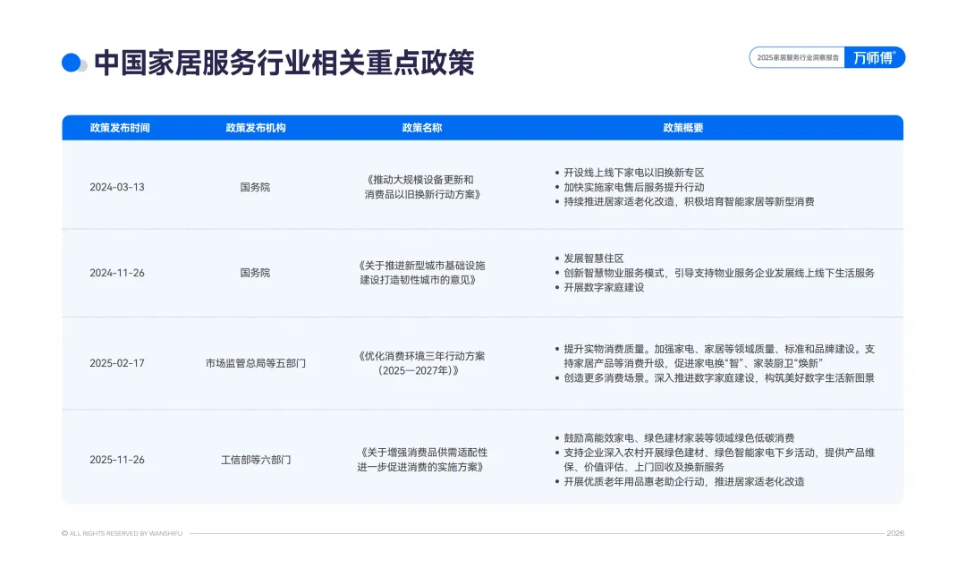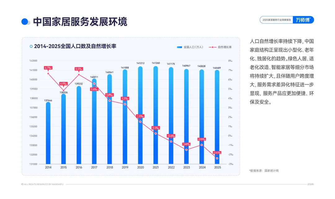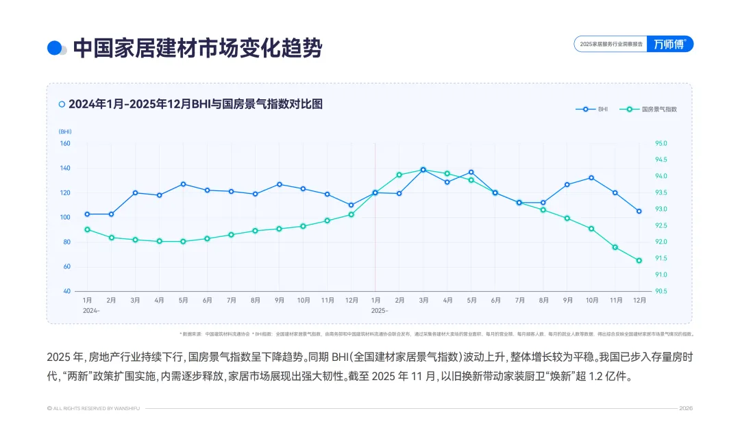 2025年的中国家居服务行业,在地产下行与存量房主导的市场环境里,靠着以旧换新、适老化改造等政策支撑稳住了增长节奏,整体市场规模达到3840亿元。行业消费主力集中在26至40岁的女性群体,她们更看重服务质量、售后保障与品牌口碑,线上渠道已成消费主流。不过行业仍存在服务水平不一、售后体系不完善等问题,未来会朝着以旧换新、生态化、品质化、适老化、服务升级五大方向迈进,AI与数字化技术将成为推动行业变革的核心力量。