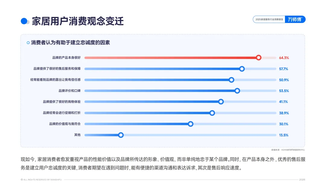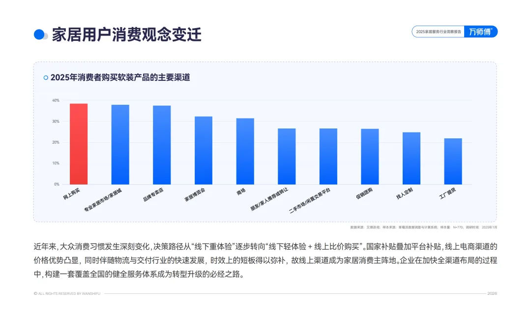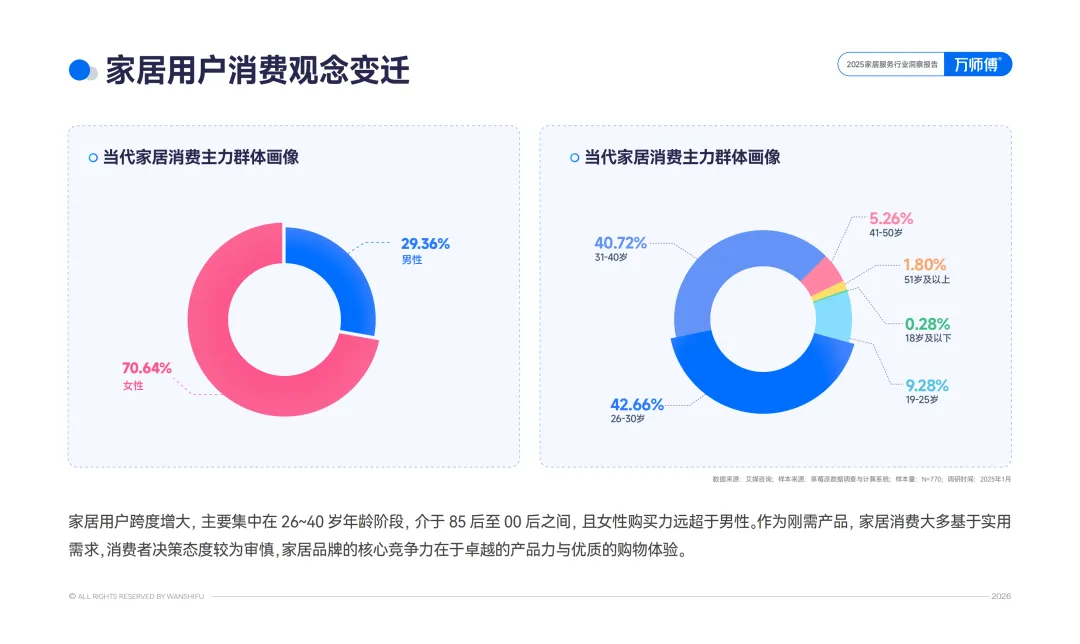 消费主力是26到40岁的女性,占比超八成三。消费习惯上偏向线上,大多选择线下简单体验后再线上下单。做选择时,超六成消费者优先考虑售后服务是否完善,其次是品牌口碑好不好,需求上更偏向实用、优质服务和个性化,超过一半的家庭每季度都有一到两次家居服务需求。