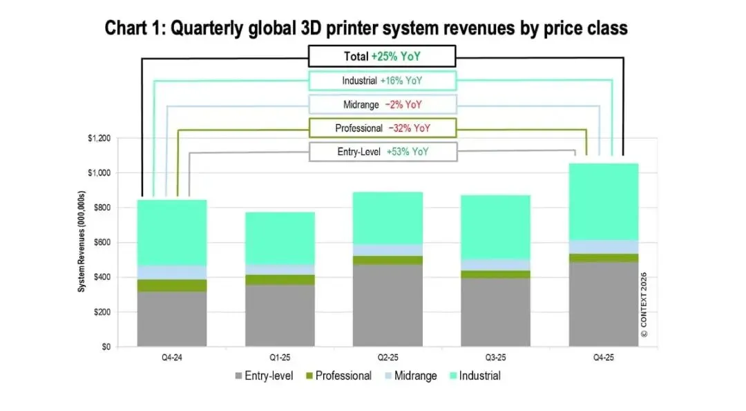 价格亲民的入门级机型在2025年第四季度销量大涨47%,全球3D打印市场在2025年末迎来强劲反弹,桌面级3D打印正式走向大众市场。据市场情报公司Context最新发布的数据显示,桌面级3D打印成功带动整个行业走出长达两年的低潮期。