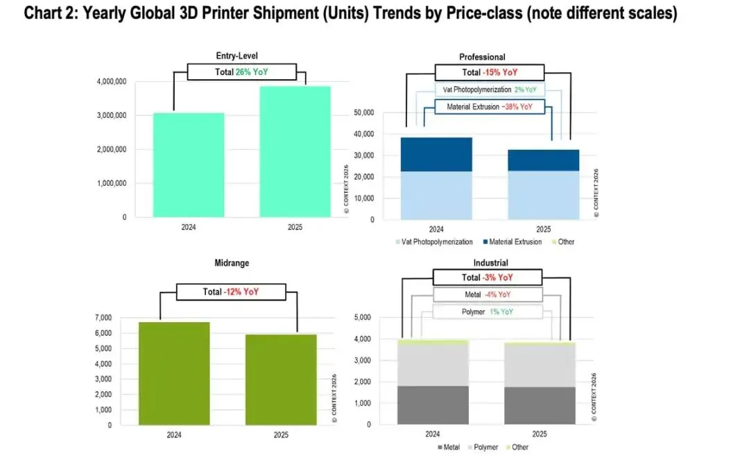 展望未来,Context预计,2026年所有价格区间的3D打印设备市场都将实现增长。入门级系统仍将保持最快增速,而工业级设备出货量预计将实现接近两位数的增长。