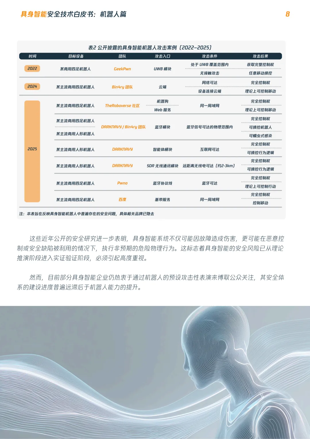 本白皮书希望通过对具身智能机器人关键风险、攻击路径与防护重点的系统梳理,为行业提供有价值的分析参考,推动安全能力建设与技术发展同步推进。我们呼吁产业界、研究界与监管相关方共同关注具身智能在真实世界中的安全挑战,加快形成与之相适应的安全评估、治理与防护体系。