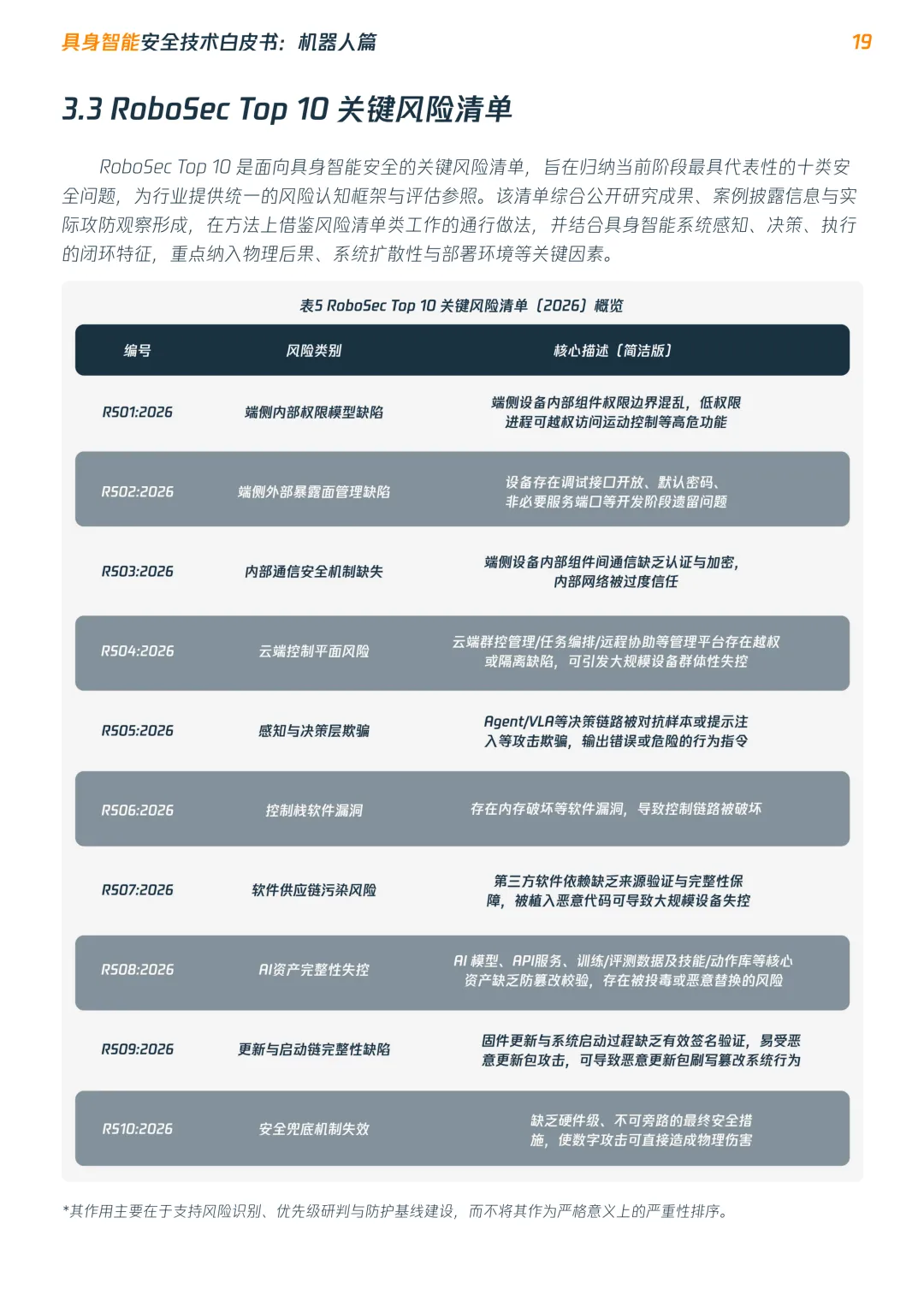 2.发布RoboSec Top 10关键风险清单。归纳具身智能机器人当前最具代表性的十类高危问题,覆盖端侧权限、云端通信、控制逻辑、感知欺骗与AI资产完整性等核心环节。