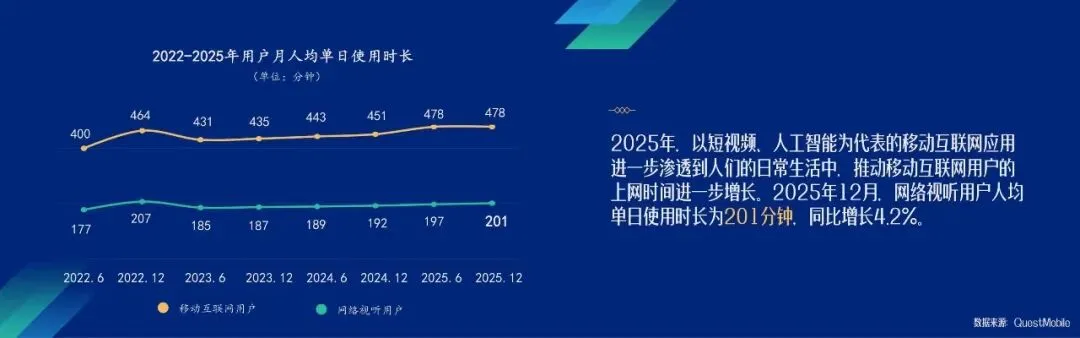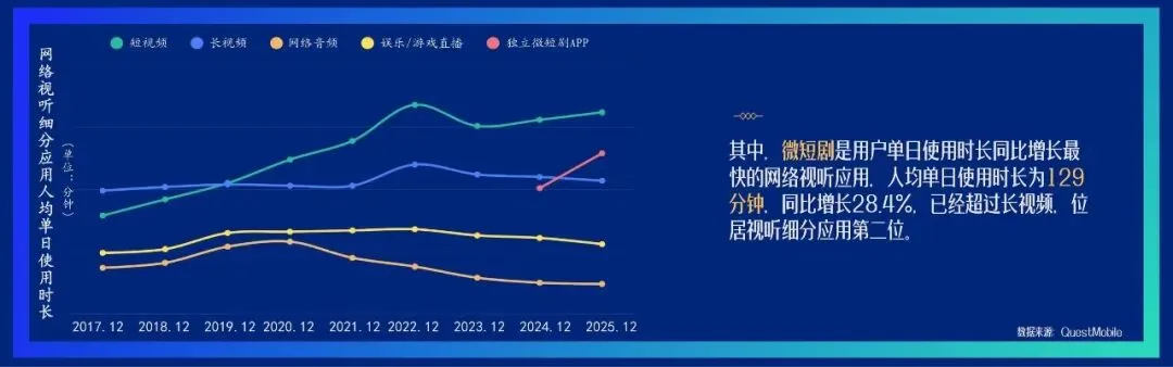 2026年中国网络视听发展研究报告显示,我国网络视听行业已迈入高质量发展新阶段。截至2025年12月,行业用户规模达10.99亿人,稳居互联网应用首位,市场规模突破1.29万亿元,展现出强劲发展韧性。短视频成为高使用率应用中唯一实现用户规模与使用率双增长的品类,微短剧使用时长增速迅猛并超越长视频,成为行业增长核心引擎。