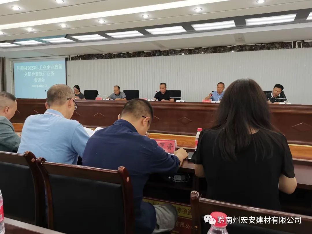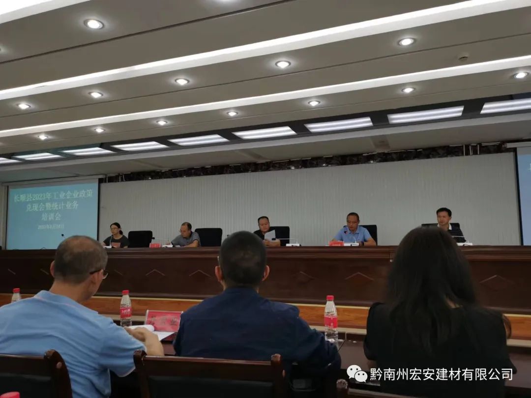 2023年8月24日,黔南州宏安建材有限公司副总黄勇,员工陈冲等到长顺县公安局二楼会议室参加全县2023年工业企业政策兑现会暨统计业务培训会。主持杨东县工信局长、工业园区书记。一、表彰相关企业:1、为获得2022年入规奖6户工业企业颁奖。2、为获得2023年新增贷款贴息的5户“专精特新”企业颁奖。二、县委常委、县人民政府副县长金兴发同志讲话。三、县统计局副局长付艳华组织学习《统计法》并就相关案例进行讲解。四、县统计局强鲁科长作工业统计业务培训。五、县工业和信息化局副局长戴露作工作安排。全县规模以上工业企业负责人和统计人员参会。