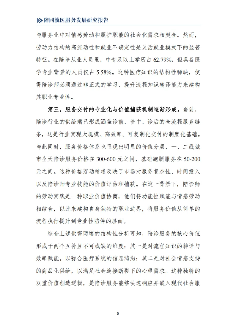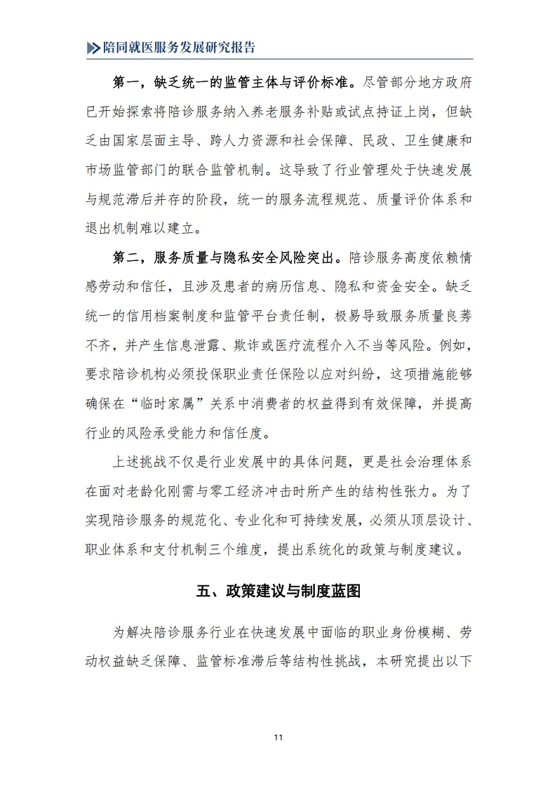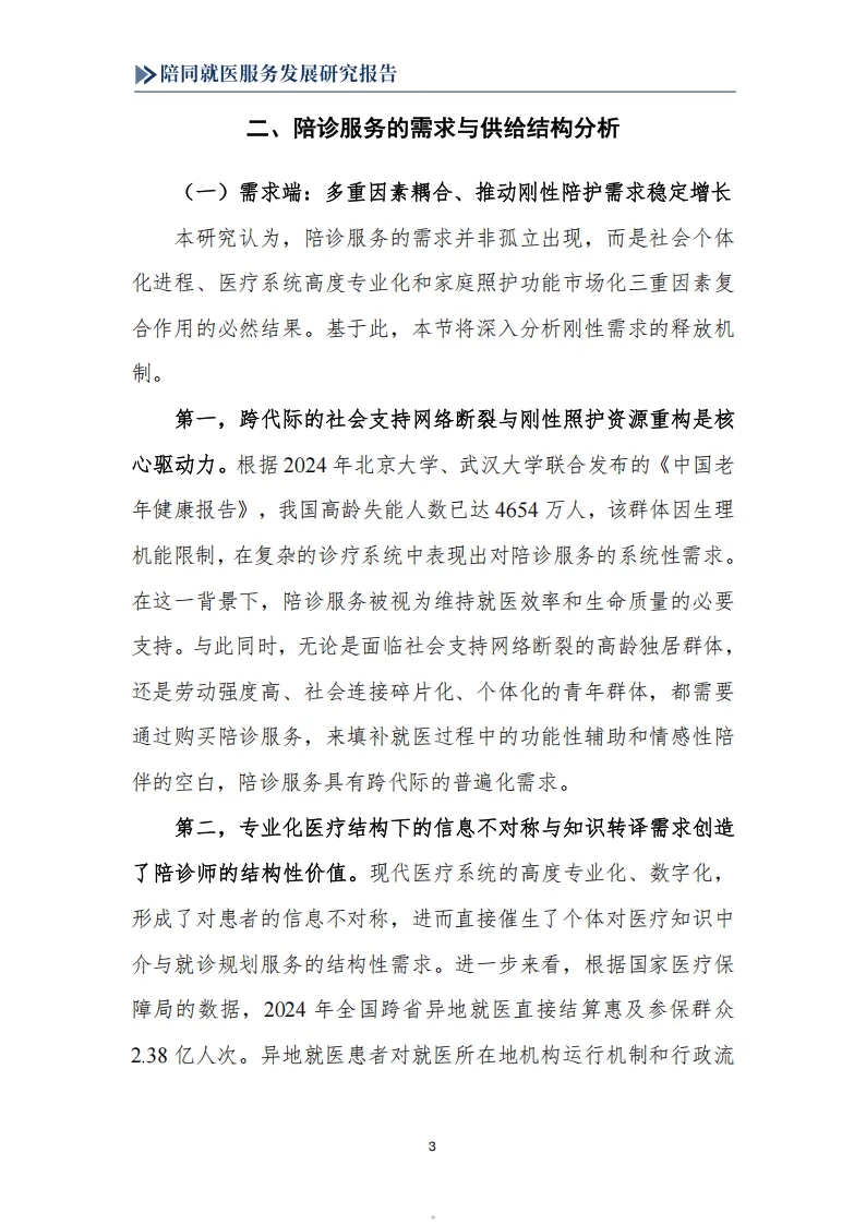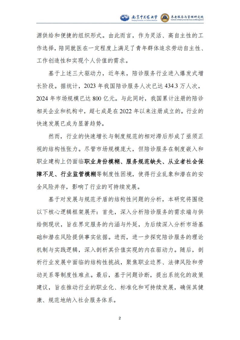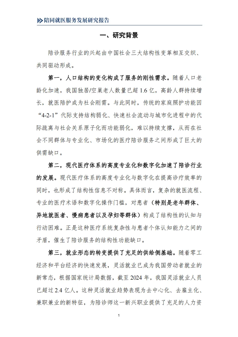 报告围绕我国陪同就医服务行业展开系统研究,指出该行业是人口老龄化、医疗体系专业化数字化、就业形态灵活化三大社会变革共同驱动下的新兴业态,兼具刚性需求与发展潜力,同时面临多重制度性困境,亟需规范化、职业化发展。