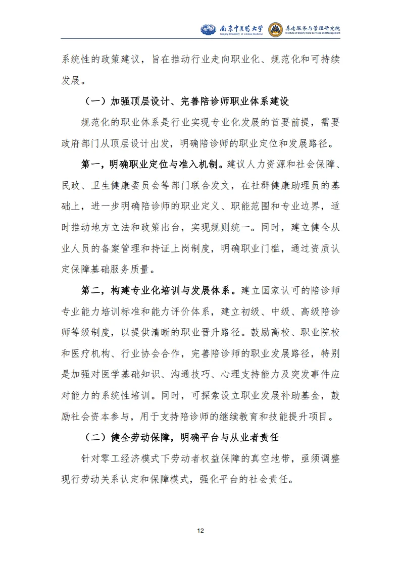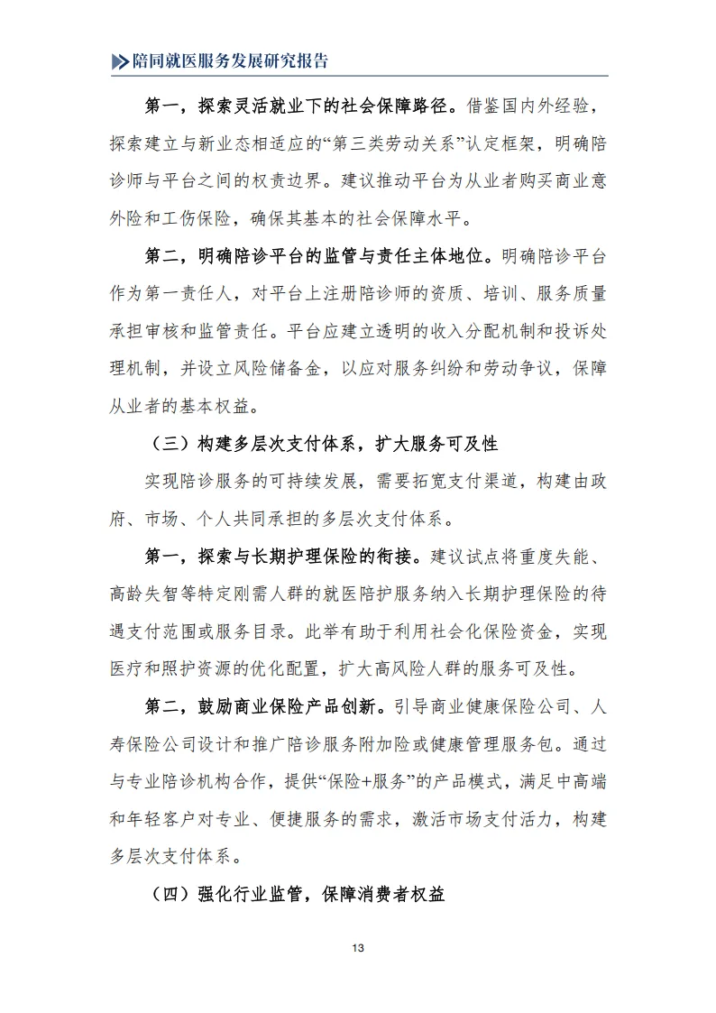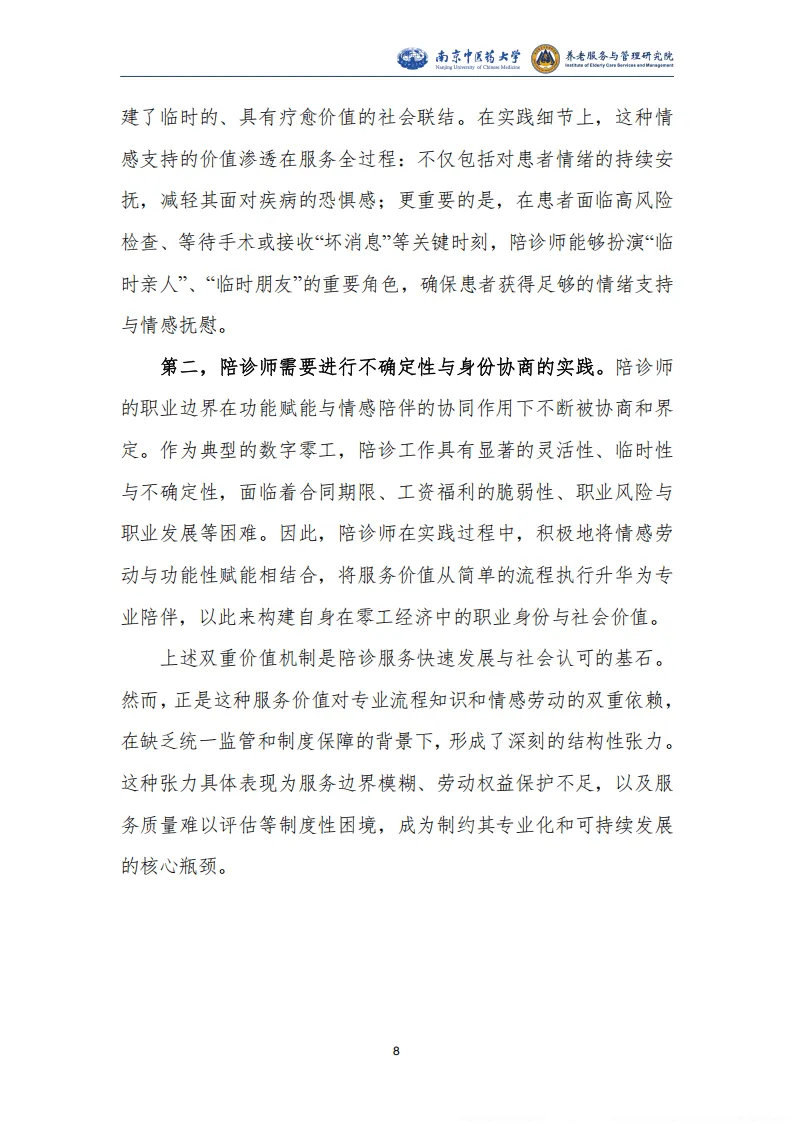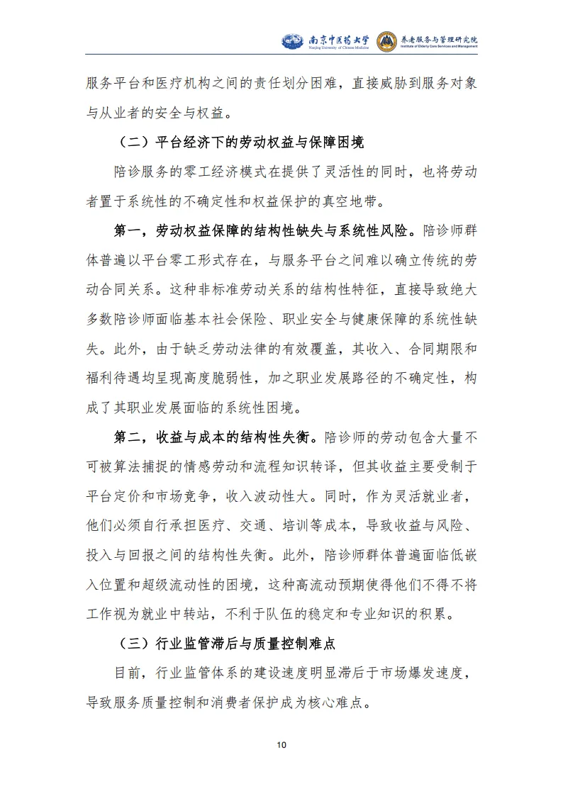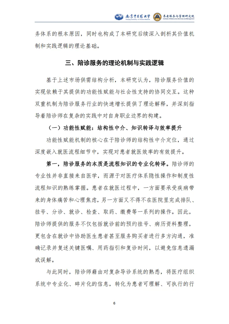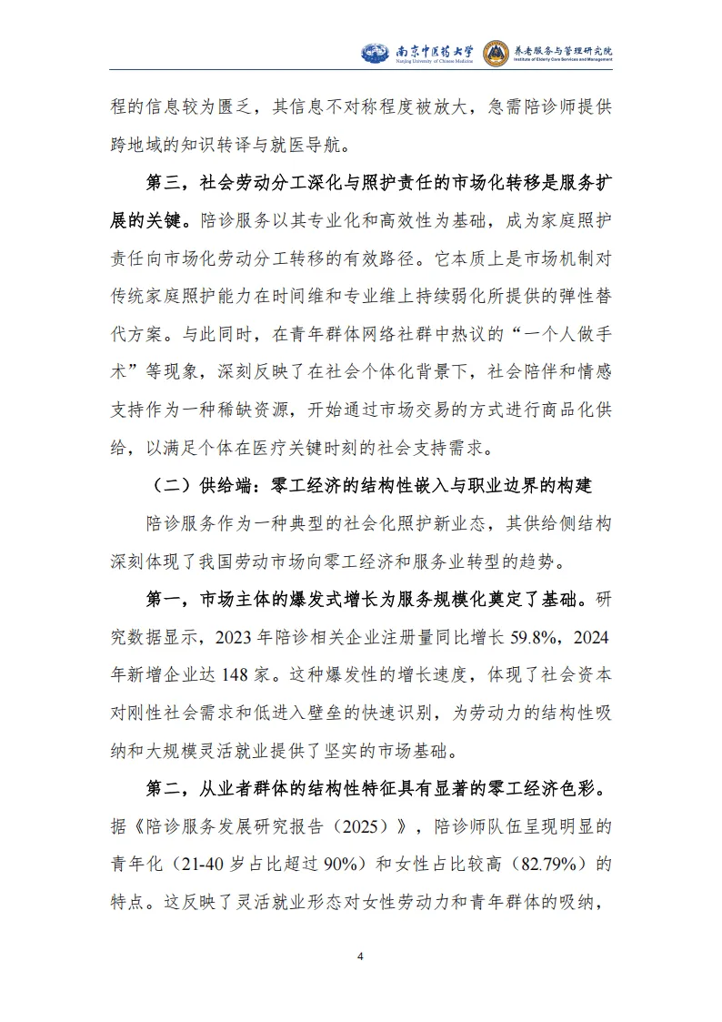 报告围绕我国陪同就医服务行业展开系统研究,指出该行业是人口老龄化、医疗体系专业化数字化、就业形态灵活化三大社会变革共同驱动下的新兴业态,兼具刚性需求与发展潜力,同时面临多重制度性困境,亟需规范化、职业化发展。