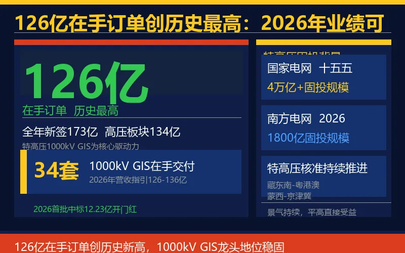 真正决定趋势的是:1000kV GIS是特高压输电核心设备,准入门槛极高,平高是国内少数具备全球竞争力的供应商。34套1000kV GIS在手,是2026-2027年高压板块持续增长的压舱石。