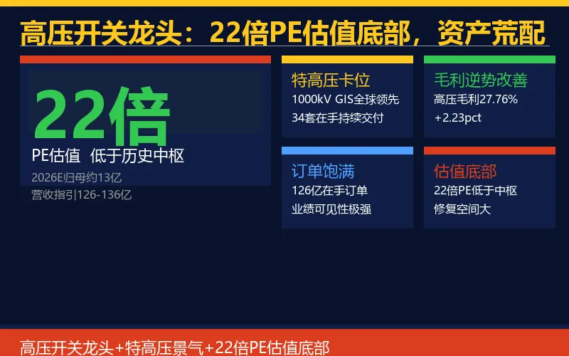 关键结论来了:高压板块毛利27.76%/+2.23pct,126亿在手订单历史新高,1000kV GIS全球领先,22倍PE估值底部值得重视。在资产荒背景下,平高作为特高压GIS龙头配置价值凸显。