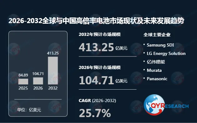 根据QYR(恒州博智)的统计及预测,2025年全球高倍率电池市场销售额达到了84.89亿美元,预计2032年将达到413.2亿美元,年复合增长率(CAGR)为25.7%(2026-2032)。