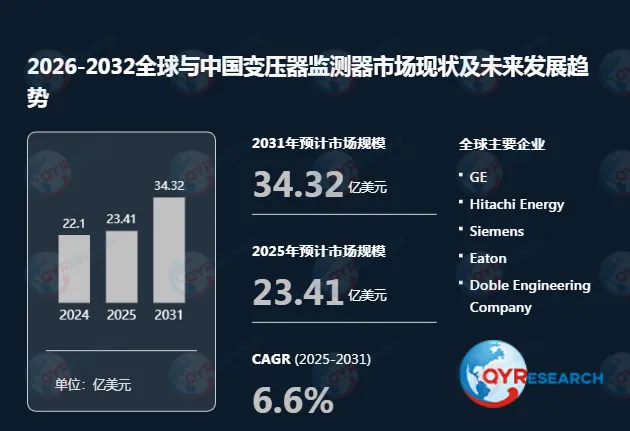 根据QYR(恒州博智)的统计及预测,2025年全球变压器监测器市场销售额达到了23.41亿美元,预计2031年将达到34.32亿美元,年复合增长率(CAGR)为6.6%(2025-2031)。