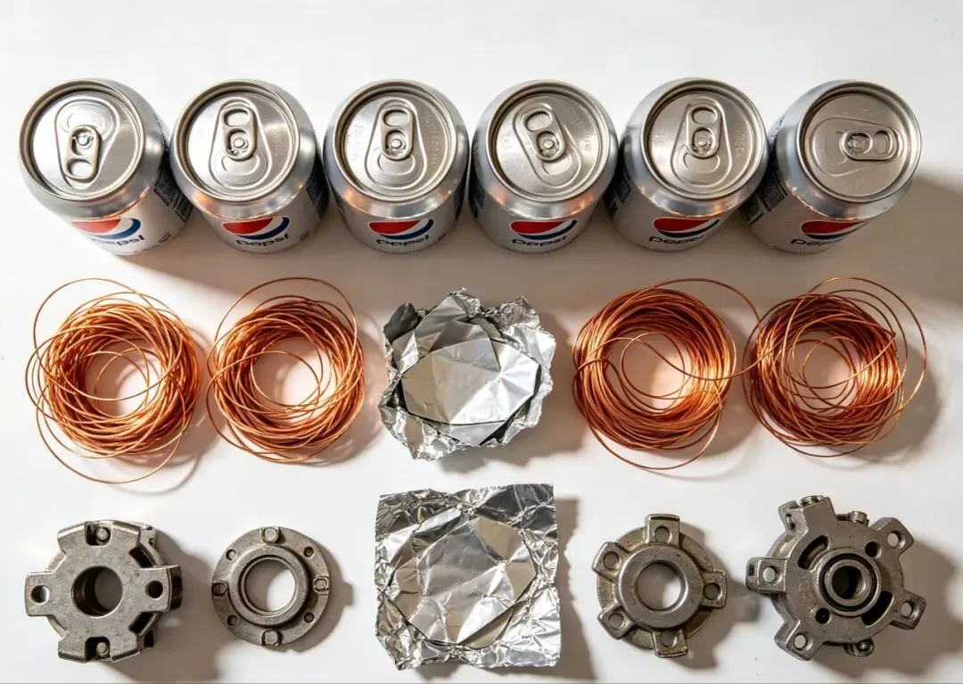 金属类可回收物单位价值最高,主要有易拉罐、铜丝、铝箔、铁钉、金属厨具等。铜、铝、铁等金属回收后可重熔再生,回收能耗远低于原生金属冶炼,例如回收 1 吨铝仅需原生铝生产 5% 的能源。