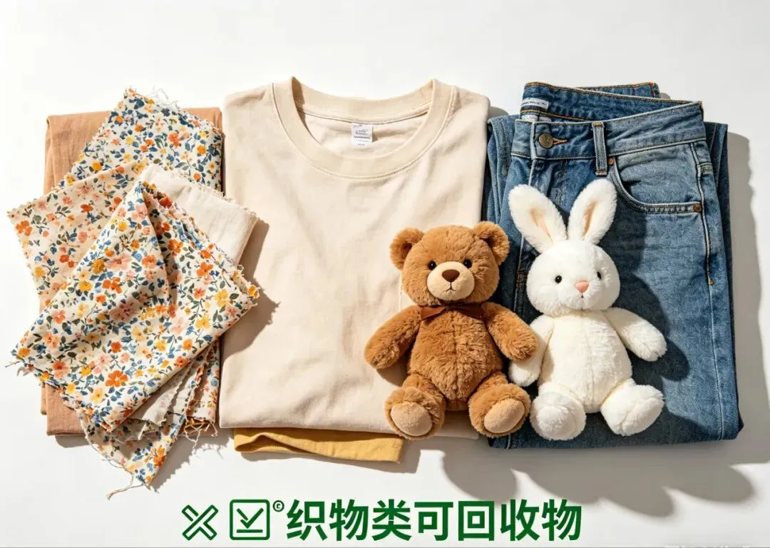 织物类包括干净衣物、床单、窗帘、毛绒玩具、书包等,其纤维可重新加工为工业保温棉、再生布料、汽车内饰等,品质较好的织物还可通过公益捐赠实现二次利用。