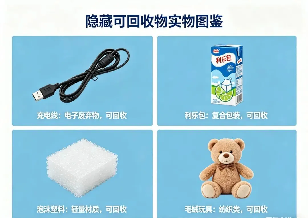 除主流品类外,生活中存在大量易被忽视的隐藏可回收物,这些品类因体积小、材质特殊、回收渠道小众,常被误投为其他垃圾,实则具备较高的资源化价值: