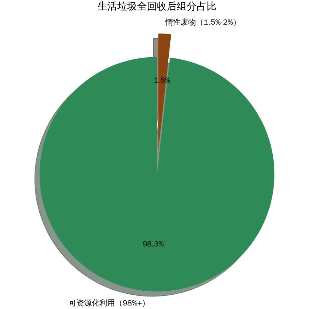 若实现生活垃圾尽可能回收利用(可回收物精准回收、厨余垃圾生化处理、有害垃圾单独处置),结合生活垃圾组分数据与资源化技术现状,最终剩余的 “无用废物” 占比极低: