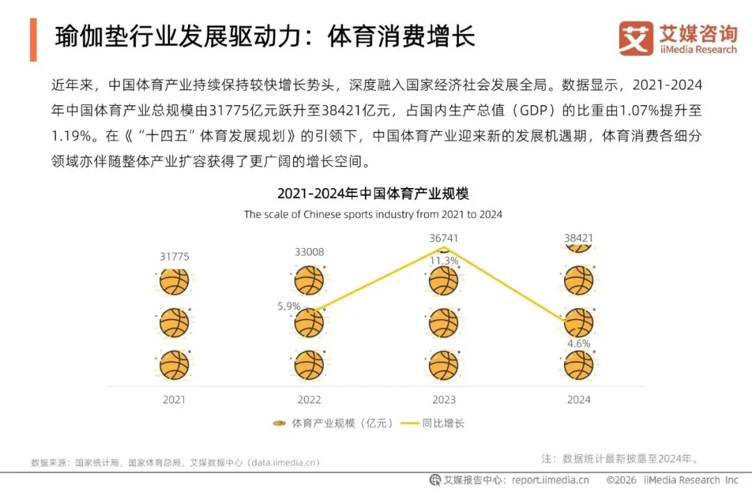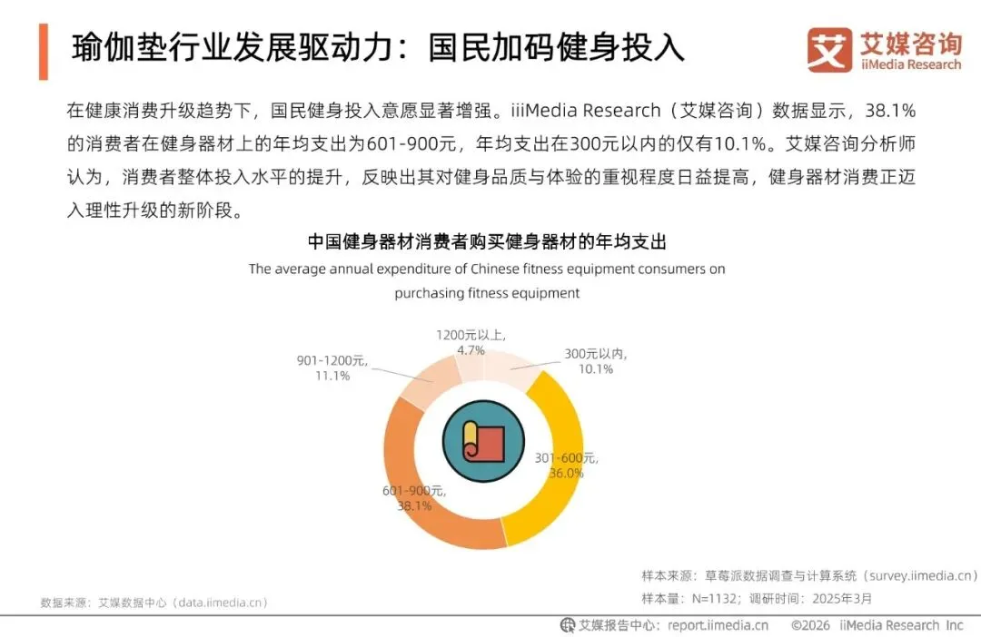 行业增长受益于四大驱动力。第一,体育产业规模持续扩大,2024年中国体育产业总规模达38421亿元,占GDP比重1.19%。第二,国民运动参与度显著提升,2010-2025年间经常参加体育锻炼人数累计增加约1.5亿人。第三,消费者健身投入意愿增强,38.1%的用户年均健身器材支出在601-900元之间。第四,体育用品电商渠道释放红利,2024年电商销售额达3337.45亿元,同比增长22.59%。