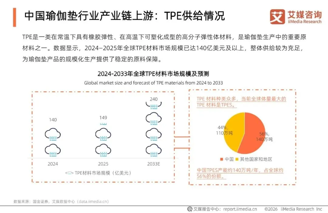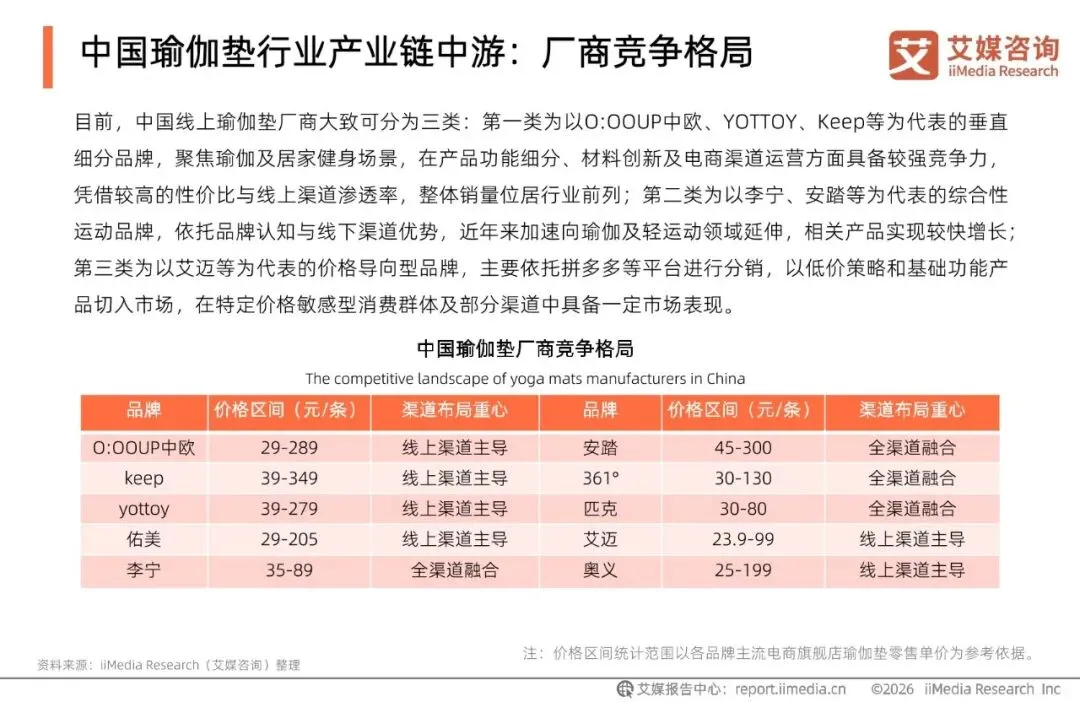 产业链上游TPE材料全球市场规模达140亿美元以上,供给充足。中游厂商呈现三类格局:O:OOUP中欧、Keep等垂直品牌以线上渠道和产品创新领先;李宁、安踏等综合品牌线上线下融合渗透;价格导向型品牌依托拼多多等平台切入。下游应用场景中,家庭日常练习占比41%,瑜伽馆及健身房占34%,居家化、多元化趋势显著。
