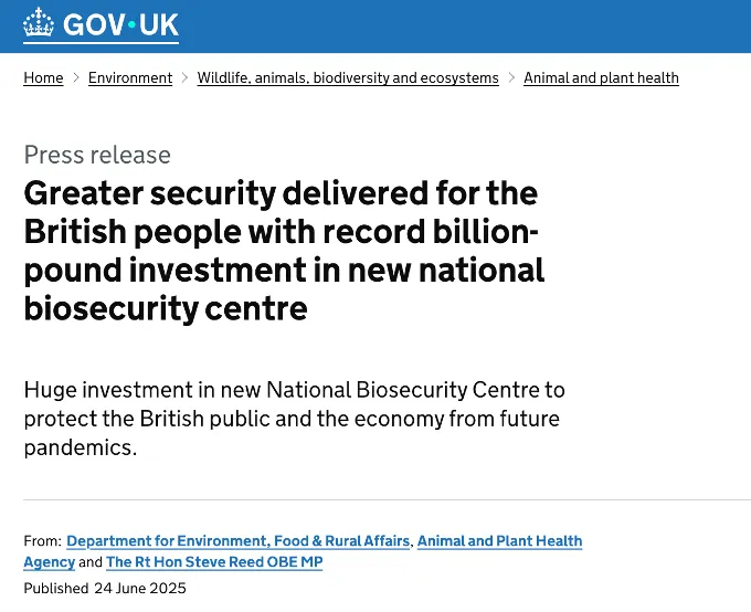 [3] GOV.UK. Greater security delivered for the British people with record billion-pound investment in new national biosecurity centre. 2025.06.24. https://www.gov.uk/government/news/greater-security-delivered-for-the-british-people-with-record-billion-pound-investment-in-new-national-biosecurity-centre.