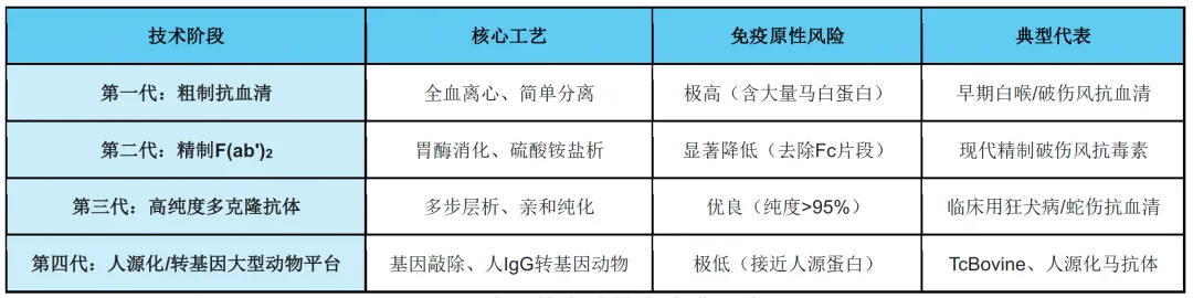 值得留意的是,抗血清本身正在经历一条清晰的现代化路径。事实上,抗血清的诞生与演进几乎与现代免疫学同步。自1890年埃米尔·冯·贝林(Emil von Behring)与北里柴三郎发现免疫动物血清可中和白喉和破伤风毒素以来,抗血清便开启了人类对抗烈性传染病的“救命药”时代。这一跨越一个多世纪的技术历程,可以清晰地划分为四个关键的发展阶段,每一个阶段都伴随着安全性与有效性的质变。