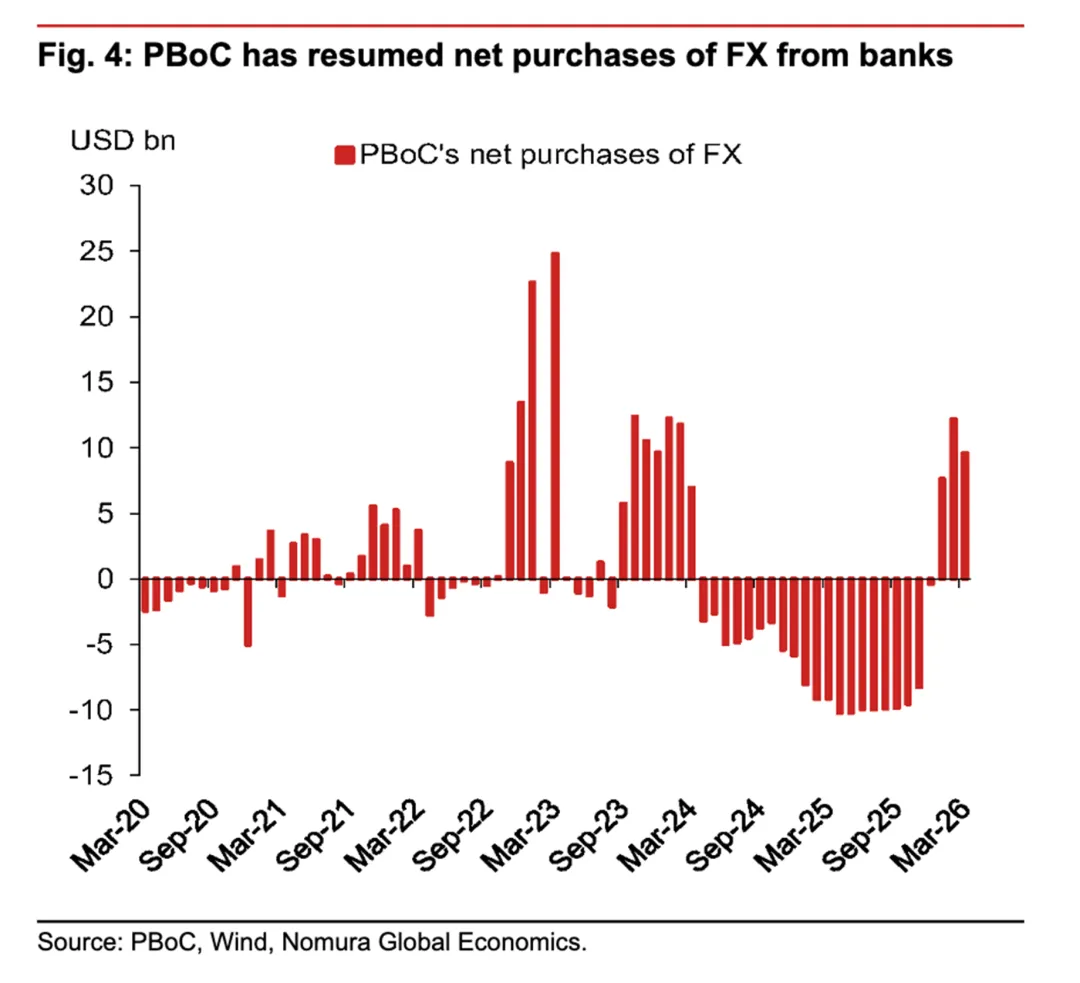1.面对人民币的持续升值,中国央行已于2026年1月结束了此前连续21个月的外汇净卖出操作,转为从商业银行净买入外汇,并连续三个月执行该操作,其中3月份净购入96亿美元。此前,在人民币升值预期下,企业和个人结汇意愿强烈,3月结汇率高达71.0%。央行通过购汇来吸收市场上过剩的外汇供给,以此防止因大规模货币兑换而可能引发的国内金融体系流动性被动收紧。