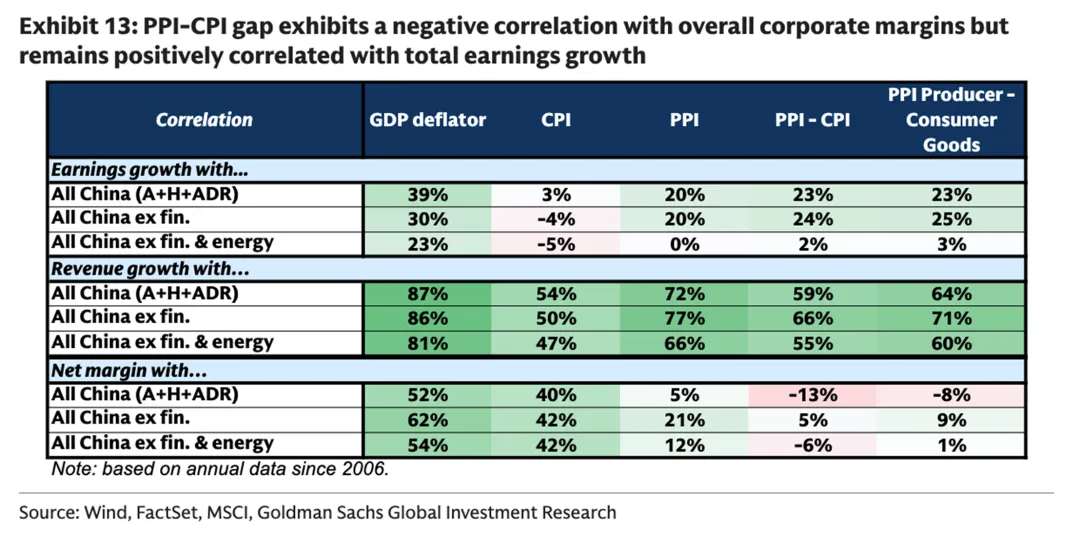 2.自2006年以来的数据显示,生产者价格指数与消费价格指数的剪刀差(PPI-CPI)扩大,对中国上市公司整体的净利润率呈现负相关性(相关系数-13%),但同时却与总盈利增长保持正相关(相关系数23%)。这种分化源于中国上市公司的利润结构,其中能源、材料等上游行业的利润池规模远大于下游消费行业。当剪刀差扩大时,上游企业因价格上涨带来的盈利增量,其体量足以覆盖下游企业因成本增加而遭受的利润率侵蚀,从而在宏观层面推动了整体盈利总额的增长。