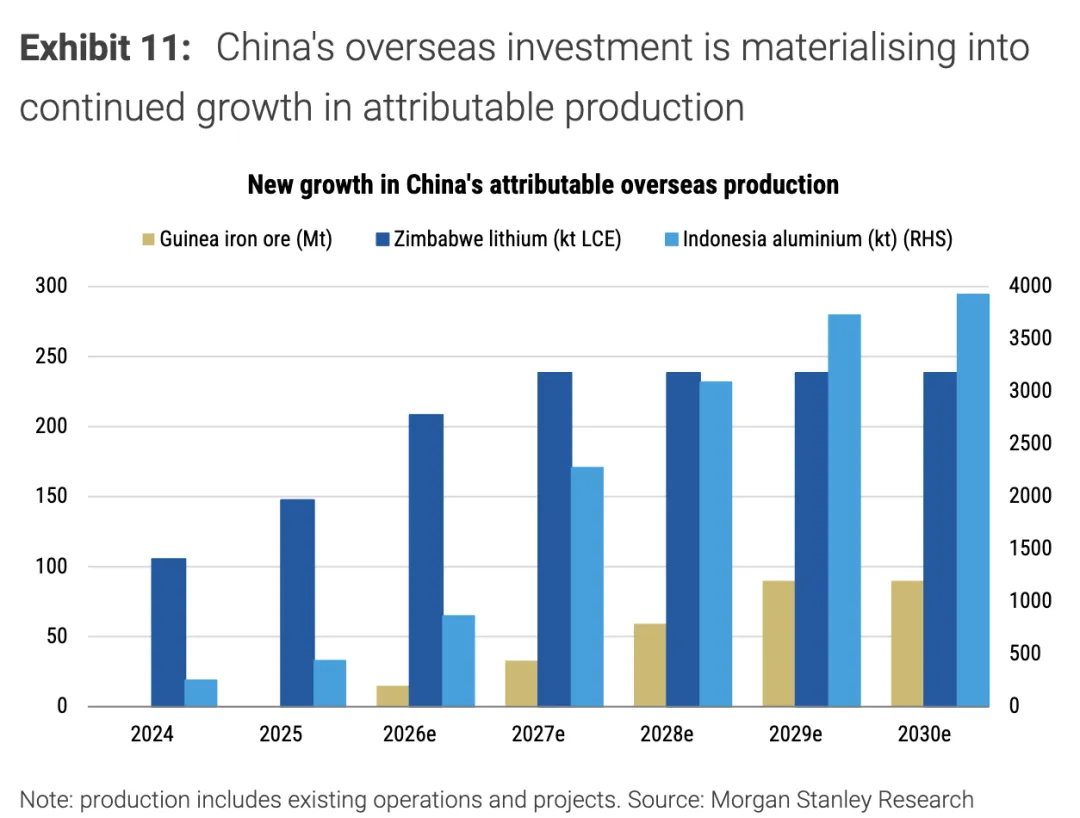 5.中国对海外矿产资源的投资正转化为持续的权益产量增长。根据预测,到2030年,其在几内亚的权益铁矿石年产量将增至约9000万吨,在津巴布韦的权益碳酸锂当量产量将达到24万吨,而在印度尼西亚的权益铝产量将接近400万吨。自2023年以来,中国对海外采矿与加工项目已投入1200亿美元资金,其通过股权并购与产品包销协议等方式锁定供应,例如其全球铜矿权益占比已从2015年的13%增至2025年的逾20%,同时中核集团也通过项目融资锁定了纳米比亚一处铀矿60%的承购权。