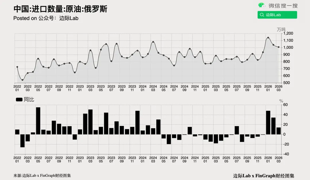 6.海关总署最新数据显示,2026年3月,中国从最大原油供应国俄罗斯进口原油1,007万吨,折合237万桶/日,同比增速达到14%。