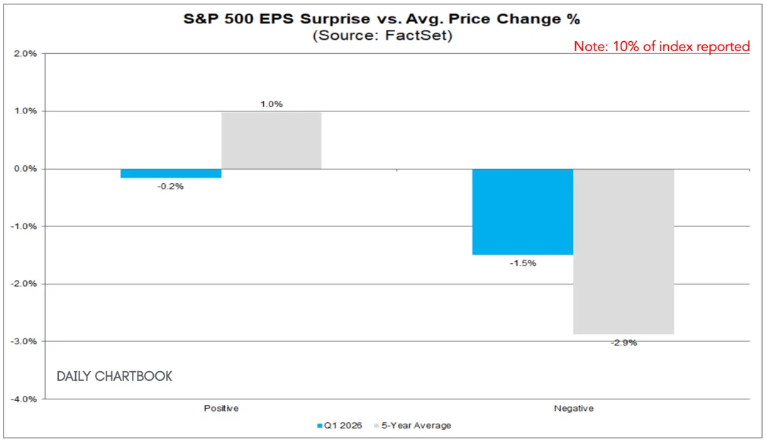 2.2026年第一季度财报季的市场反应呈现反常模式。对于公布的盈利超出预期的标普500公司,其股价在财报发布后平均下跌0.2%,与过去五年平均上涨1.0%的积极反应相反。而对于盈利不及预期的公司,其股价平均下跌1.5%,这一跌幅远小于过去五年2.9%的平均惩罚力度。