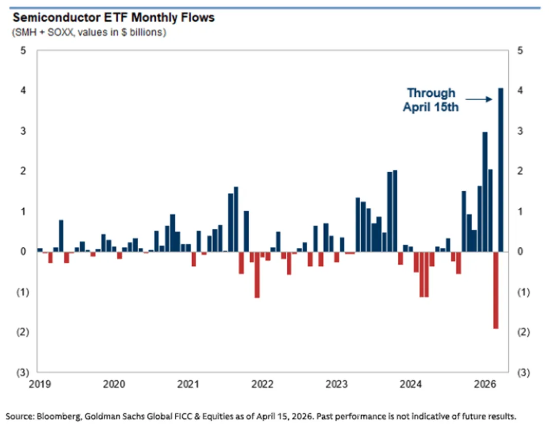 3.流入主要半导体行业ETF(SMH与SOXX)的资金正朝着创下月度历史新高的方向发展。截至4月仅半个月时间,这两只基金的合计净流入额已达到40亿美元。