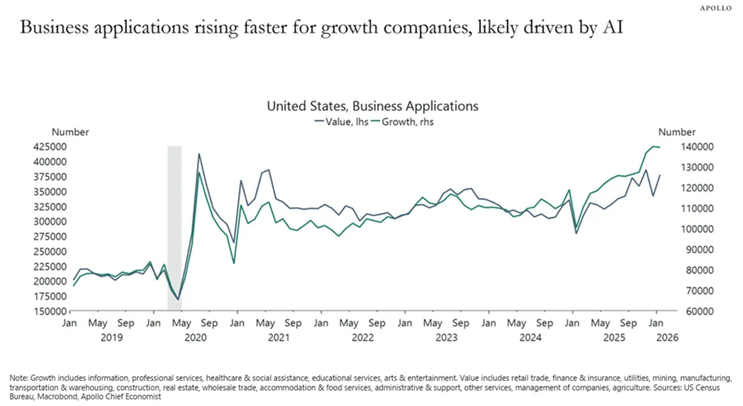 4.美国新企业申请数量已回升至疫情期间的高位,但内部结构正发生显著分化。自2023年中期起,代表信息与专业服务等领域的成长型公司申请量持续走高,至2026年初已接近14万份,并与包含零售和金融业的价值型公司申请量拉开差距。这种增长差异被认为是由人工智能初创企业的激增所驱动,其背后逻辑在于大语言模型等技术工具的普及,极大地降低了创业的技术与资金门槛。