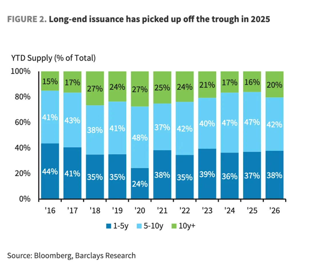 5.美国企业长期债券的发行供应正在从2025年的低谷中恢复,期限为10年及以上的债券在2026年迄今总发行量中的占比已回升至20%,高于2025年16%的水平,后者是自2009年以来的最低点。此轮回升的主要驱动力来自超大规模科技公司的融资需求,这种发行结构向长久期的倾斜,不仅影响市场对新增供给的消化能力,也已成为推动投资级债券指数久期机械性延长的关键因素。