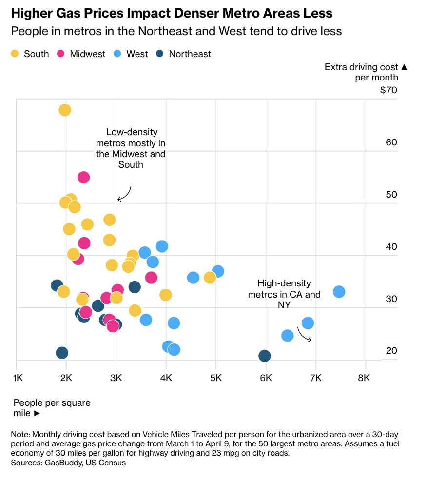 6.根据对美国50个最大都会区数据的分析,汽油价格上涨带来的经济负担在不同城市间分布不均,关键影响因素是人口密度而非油价绝对值。人口密度较低的城市,主要集中在美国南部和中西部地区,其居民因通勤距离更长而受到更严重冲击。这些区域每平方英里人口在2000至4000人左右,每月额外驾驶成本最高可达65美元。反观加利福尼亚州和纽约州等人口高度密集的地区,尽管油价高昂,但因居民平均驾驶里程较短,每月额外成本仅增加20至30美元。