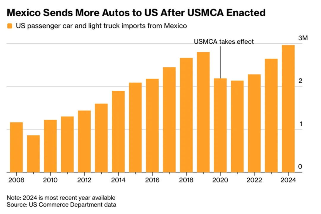 7.为推动汽车制造业回流,美国政府正考虑修改北美贸易规则以提高汽车进口的关税成本。相关讨论包括强制要求进口车辆含有最低比例的美国零部件,并限制汽车制造商利用《美墨加协定》(USMCA)降低关税的能力。此前,美国从墨西哥进口的乘用车和轻型卡车数量在经历短暂下降后持续回升,并在2024年创下近300万辆的历史新高。这表明现有要求75%零部件来自北美的规则,未能有效促使生产线大规模迁回美国。