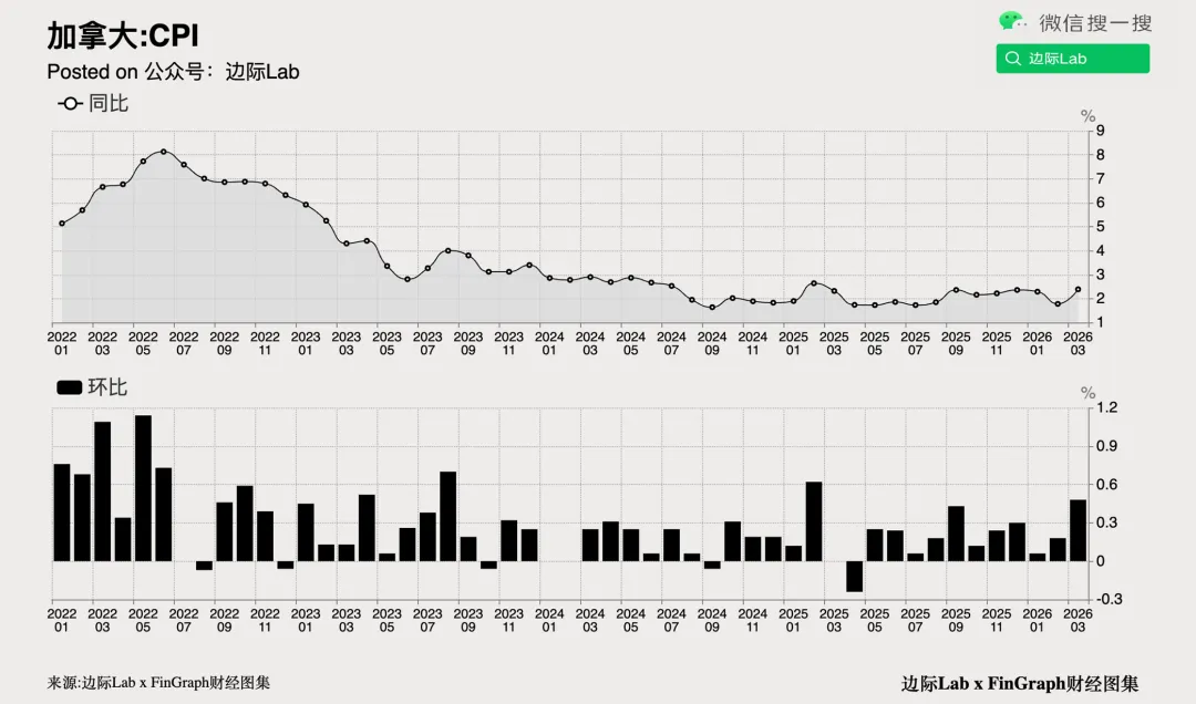 2026年3月,加拿大CPI同比增速从上月的1.8%大幅升至2.4%,创一年新高,但略低于市场预期的2.5%。此次增长主要受中东战事引发全球能源短缺的初步影响。其中,能源CPI同比增速由上月的下滑9.3%转为增长3.9%,进而推动交通CPI同比增速从-0.8%升至3.7%。住房和娱乐教育类价格也出现加速上涨,住房CPI同比增速升至1.7%,娱乐教育CPI同比增速更跃升至2.6%。与此同时,食品CPI同比增速则从2月的5.4%回落至4%。当月CPI环比增长0.9%,主要因汽油成本环比飙升21.2%所致。