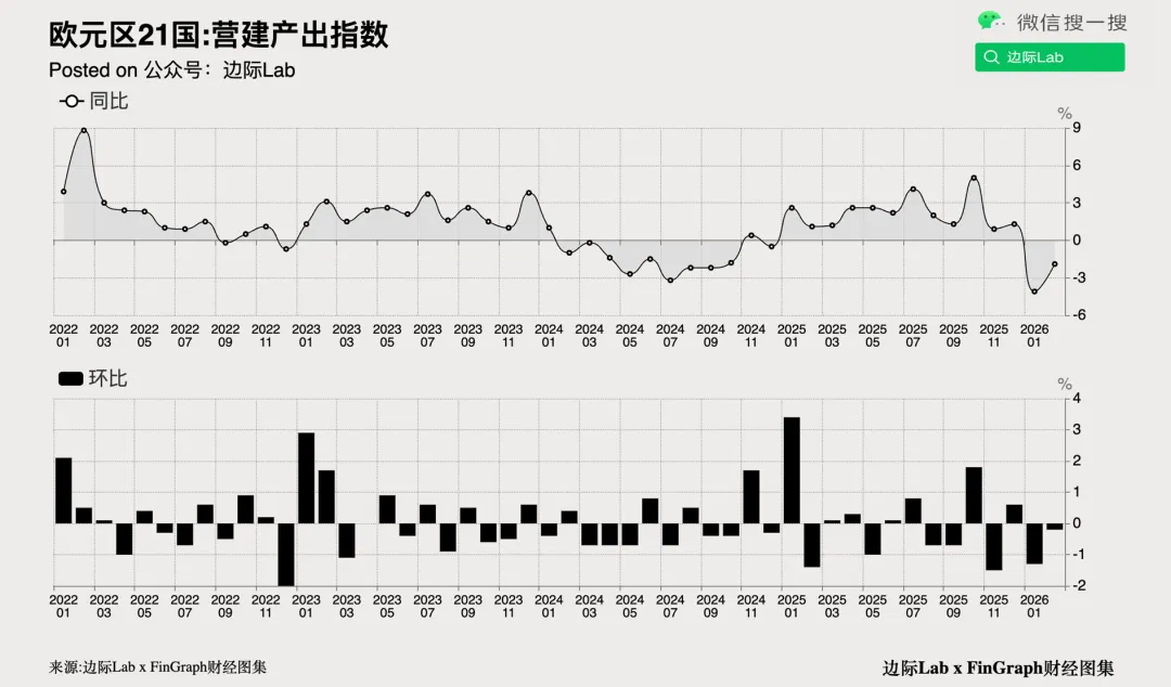 1.2026年2月,欧元区建筑业产出同比下降1.9%,这是继1月份向上修正的4.1%降幅之后,该行业连续第二个月收缩。其中,建筑施工活动仍是主要拖累因素,同比萎缩8.1%,不过土木工程和专业建筑活动的下降速度有所放缓。主要经济体中,德国和法国的产出均录得下降,西班牙更是大幅下滑10.2%,而意大利则逆势增长1.4%。环比来看,建筑业产出下降0.2%。