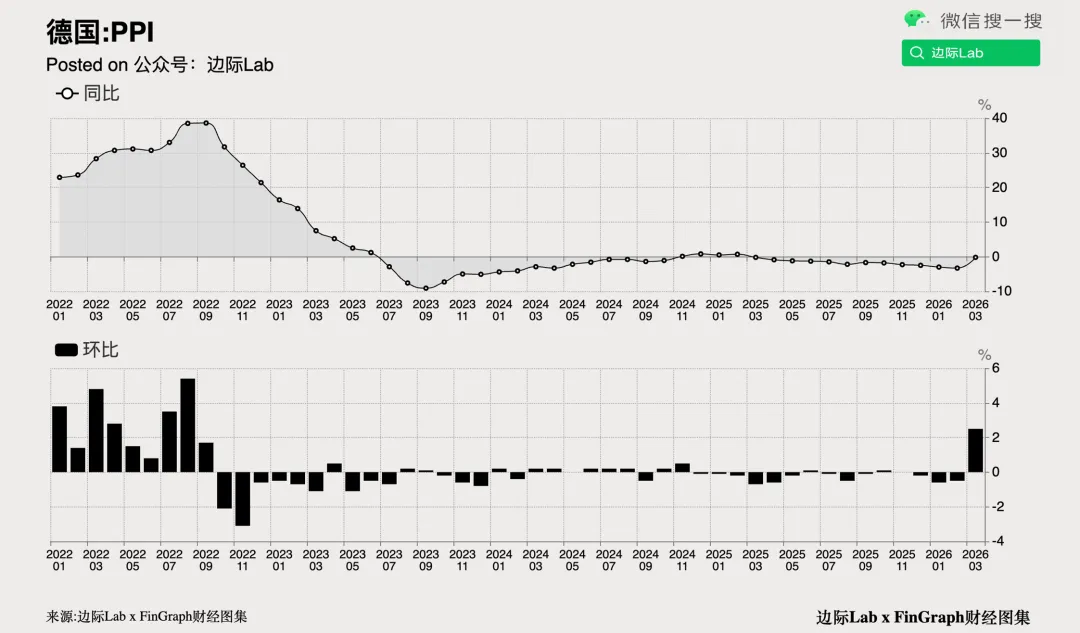 2.2026年3月,德国生产者价格同比下降0.2%,降幅较2月收窄,创下自去年3月以来最小降幅。这主要得益于能源价格同比跌幅放缓至3.2%;尽管天然气和电力成本下降,但受中东局势影响,矿物油产品价格显著上涨抵消了部分降幅。同时,非耐用消费品价格略有下降,而资本品、耐用消费品和中间产品价格则继续上涨。当月生产者价格环比大幅上涨2.5%,创2022年8月以来最大增幅,且远超市场预期的1.4%。