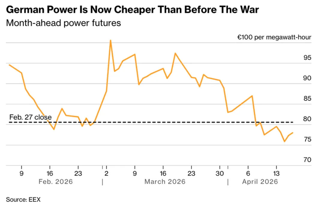 3.欧洲电力期货价格已跌破中东冲突爆发前的水平,德国一个月后交割的电力期货价格交投于每兆瓦时78欧元附近,低于2月27日收盘时的80.57欧元。价格下行的主要驱动力来自可再生能源发电量激增与天然气价格回落。进入太阳能发电季节为电网注入了大量低成本电力,削弱了地缘政治紧张局势对批发价格的影响。同时,市场对中东达成停火的乐观情绪增强,缓解了全球供应风险,也压低了作为电力定价关键基准的天然气价格。