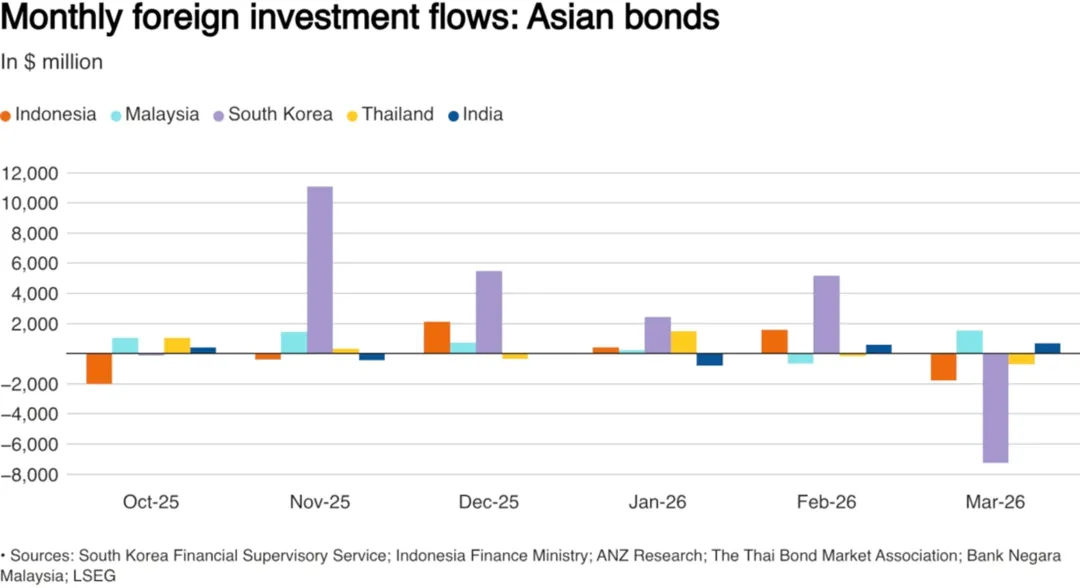 1.2026年3月,亚洲债券市场经历四年来最大的月度外资流出,投资者净赎回规模达到75.7亿美元。中东冲突引发的油气供应中断加剧通胀担忧,显著降低了投资者持有固定收益资产的吸引力。其中,韩国债券市场净流出72.5亿美元,印尼和泰国债券亦出现资金外流,而马来西亚和印度债券则吸引了跨境资金流入。