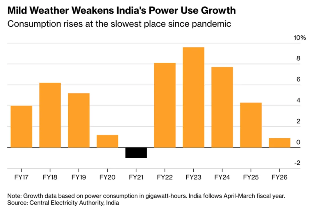 1.由于反常的温和夏季天气与充沛降雨,印度在截至2026年3月的财年电力消费增长显著放缓,由国有零售商供应的能源仅增长近1%,为2021年疫情导致用电量下滑以来的最低增速。需求疲软迫使发电厂减产并减少煤炭采购,导致矿场库存激增。市场预计,随着2026年夏季气温回升,电力需求将出现更大幅度的反弹。
