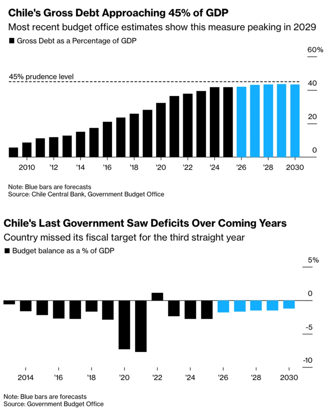 3.智利政府预算办公室数据显示,该国总债务占GDP的比重自2010年持续攀升,目前为41.7%,预计将在2029年接近45%的水平时见顶。该国财政状况持续面临压力,前政府已连续三年未能达成财政目标,且预计赤字将持续到2030年。为应对此局面,新政府推出一项包含企业减税与就业补贴的法案,意图通过刺激投资与经济增长来平衡预算。