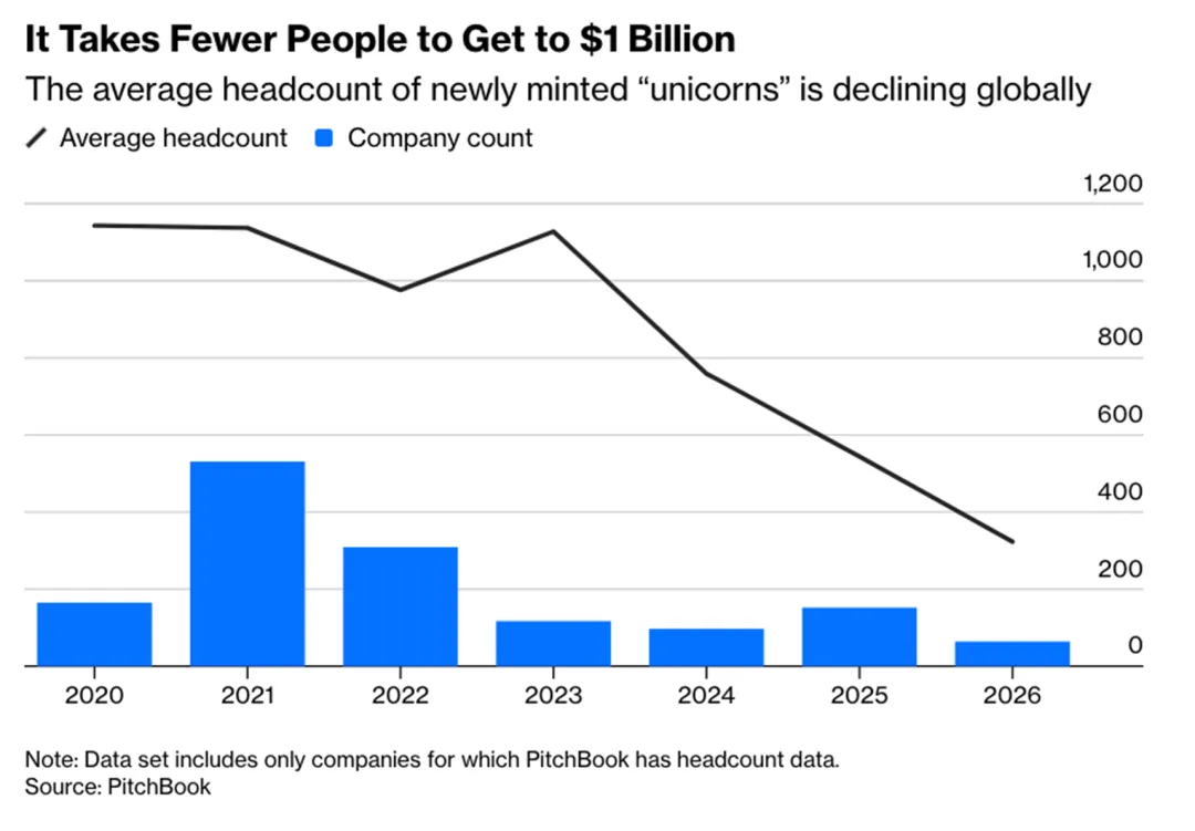 根据PitchBook数据,全球新晋独角兽公司的平均员工规模正显著收缩,从2023年超过1000人的水平急剧降至2026年的约300人。这种向更精简团队结构的转变,反映出人工智能技术正使小型团队乃至个人创始人能更高效地扩大公司规模。